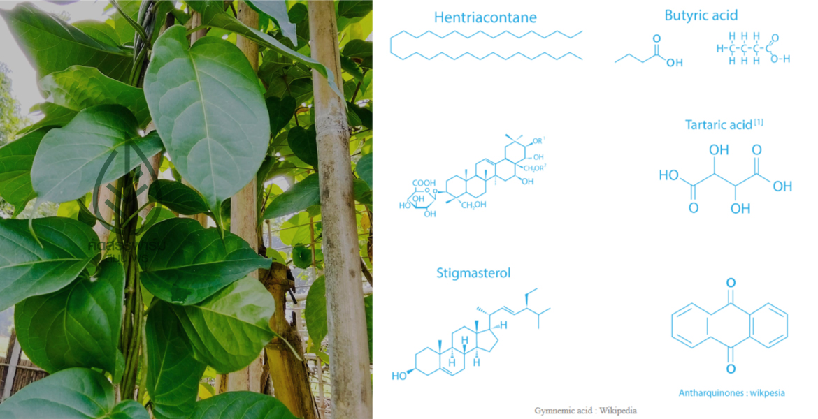 Gymnemic acid มี tri-terpenoid, glucuronic acid และกรดไขมันรวมอยู่ในโมเลกุลเดียวกัน นอกจาก Gymnemic acid ซึ่งเป็นสารออกฤทธิ์สำคัญแล้ว ยังพบสารสกัดจากผักเชียงดาที่สำคัญอื่น ๆ อีก เช่น flavones d-quercitol, tartaric acid, formic acid, butyric acid, lupeol, hentriacontane, pentatriacontane, stigma sterol, acidic glycosides และ anthroquinones5 สำหรับสารที่อยู่ในกลุ่มที่เป็นกรดอินทรีย์ และละลายน้ำได้จะมีคุณสมบัติที่เกี่ยวข้องกับระดับน้ำตาลในเลือด
